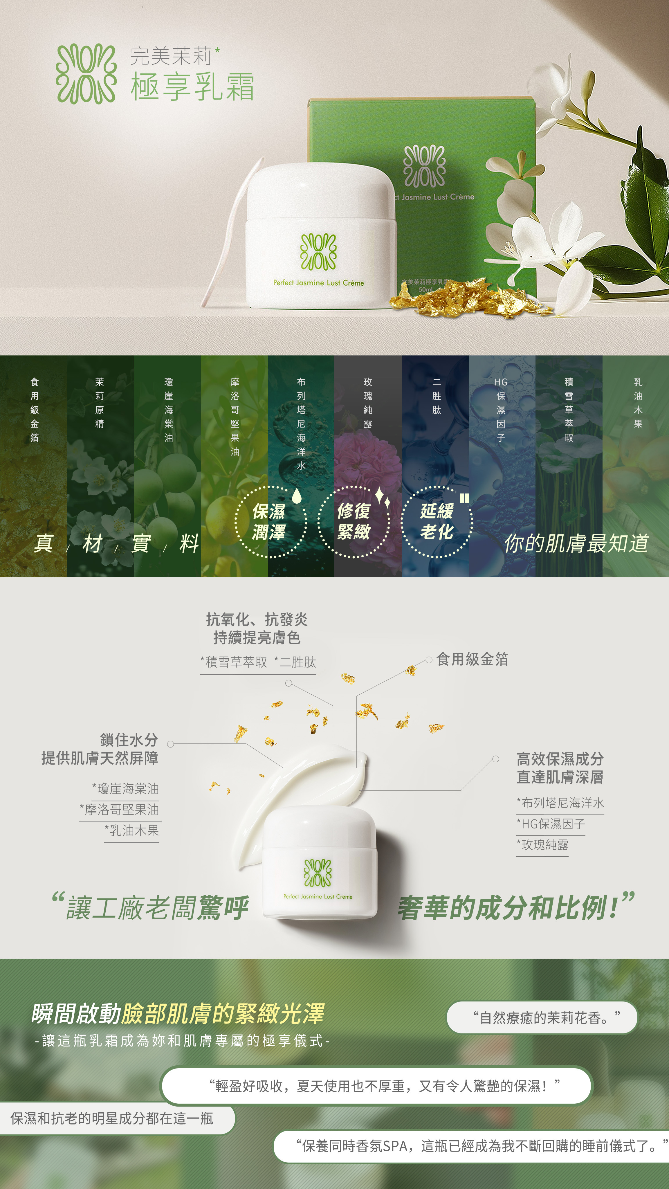 以活性食用級金箔加速所有珍貴成份吸收,獨家茉莉香氣封存技術搭配修護之王瓊崖海棠油及專利保濕因子的完美配方,讓製作廠商都驚呼「這是市面上不會有的奢華比例,是做給家人用的嗎?」